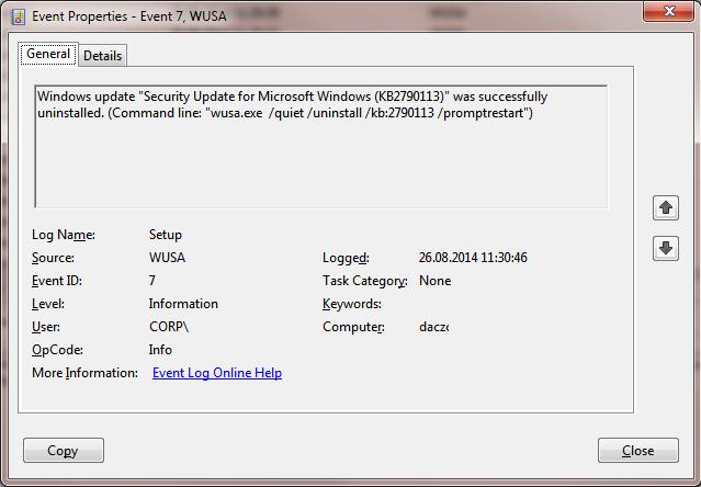 After the update has been uninstalled, this event is displayed in Windows Update History.