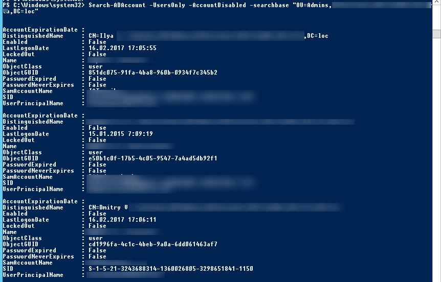 Search-ADAccount -UsersOnly -AccountDisabled -searchbase "OU=Admins,OU=Accounts,DC=woshub,DC=com"|ft -AutoSize