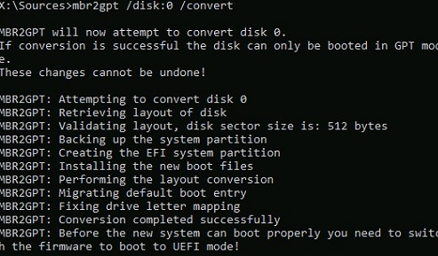 If you try to convert disks with previous Windows versions (7/8.1), the tool will give the error mbr2gpt cannot install new boot files. In this case, it is recommended that you perform in-place upgrade to Windows 10 first and only then convert the partition table.