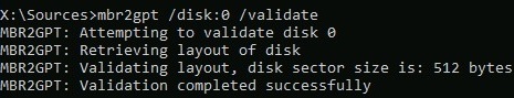 Validation completed successful, you can convert this disk;If the errorFailed to retrieve geometry for disk -1appears, most likely you have several disks connected to your computer. Run the commanddiskpart->list diskin order to identify disk numbers. You can validate a specific disk by the disk number with the command:?mbr2gpt /validate /disk:0 - To convert a disk partition table run the command