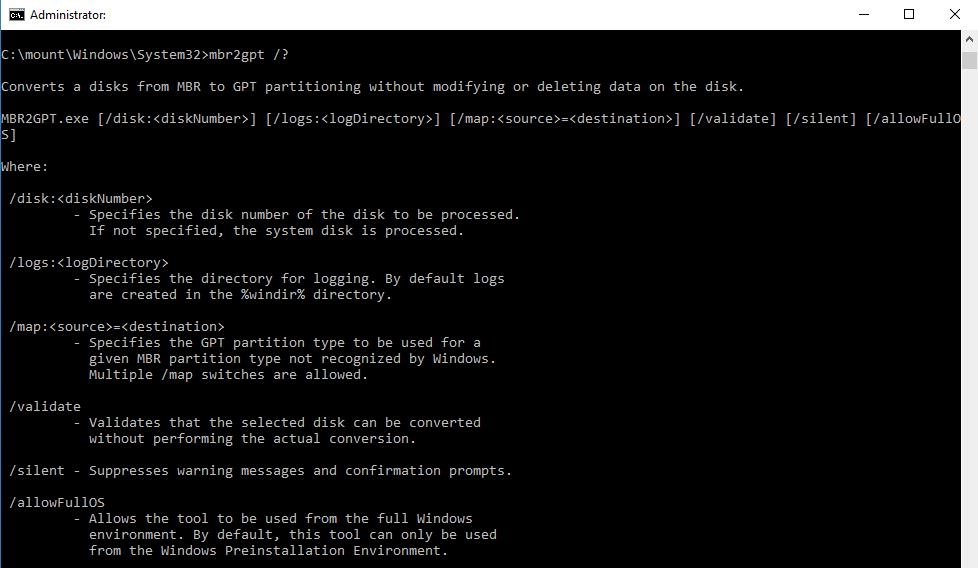 mbr2gpt /validate|convert [/disk:] [/logs:] [/map:=] [/allowFullOS]