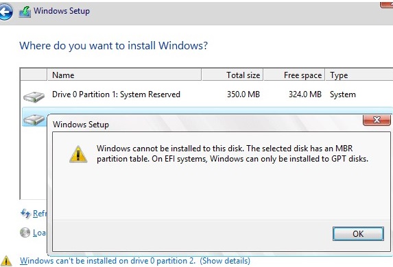 Windows cannot be installed to this disk. The selected disk has an MBR partition table. On EFI system, Windows can only be installed to GPT disks.