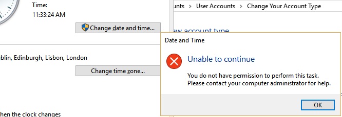 Date and time Unable to continue. You do not have permission to perform this task. Please contact your computer administrator for help.