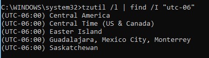 If you want to quickly find all available time zones (for example, with an UTC -6 offset), run the command: