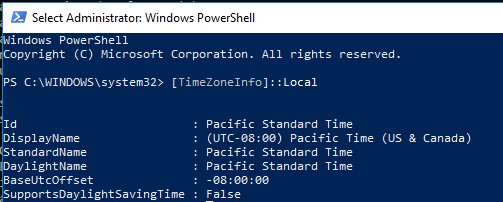 You can get the current time zone settings from the PowerShell console. Run the command: