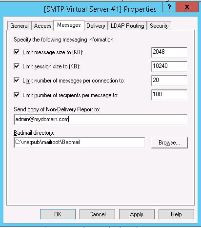 Go to the Messages tab. Here the administrative e-mail address is specified, to which the copies of all NDR messages will be send (Send copy of Non-Delivery Report to:). Also here you can specify the restrictions on the maximum message size (Limit message size KB) and the maximum number of recipients (Limit number of recipients per message).
