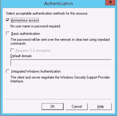 Here click the Authentication button and make sure that the Anonymous access is enabled.
