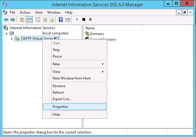 Expand the branch with your server name in the IIS 6 Manager, right-click SMTP Virtual Server and open its properties.