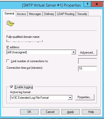 On the General tab, if necessary, select the IP address on which the SMTP server should respond (if the server has multiple IP addresses), and check the option Enable logging (in order to save information about all received emails to text log files).
