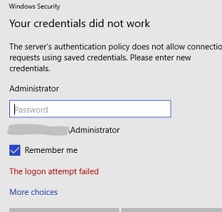 Windows Security Your credentials did not work The server’s authentication policy does not allow connection requests using saved credentials. Please enter new credentials.