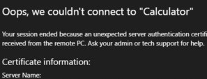 Your session ended because an unexpected server authentication certificate was received from the remote PC. Ask your admin or tech support for help.