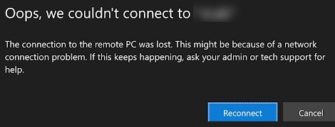 Oops, we could not connect to Calculator. The connection to the remote PC was lost. This might be because of a network connection problem. If this keeps happening, ask your administrator or tech support for help.