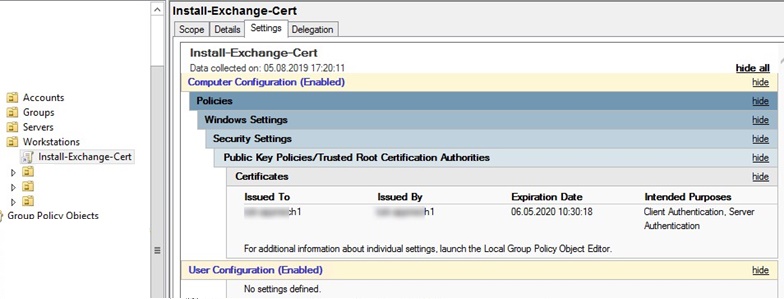 The certificate distribution policy created. You can target this policy on the clients more accurately using Security Filtering or WMI GPO filtering.