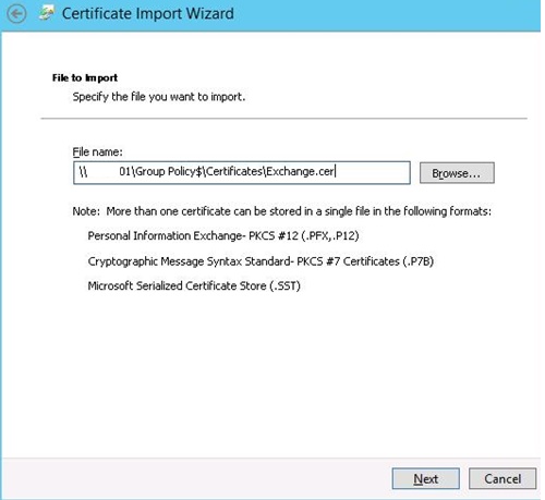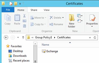 So you have exported the Exchange certificate in a CER file. You need to place the certificate file to the shared network folder and all users must have a read access to it (if necessary, the access can be restricted with NTFS permissions or the folder can be hidden using ABE). For example, let the path to the certificate file be as follows: \\lon-fs01\GroupPolicy$\Certificates.