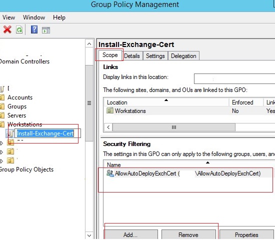 If you want to apply the certificate deployment policy only to computers (or users) in a specific AD security group, select your Install-Exchange-Cert policy in the Group Policy Management console. On the Scope tab in the Security Filtering section, delete the Authenticated Users group and add your security group name (for example, AllowAutoDeployExchCert). If you link this policy to the domain root, your certificate will be automatically installed on computers that are added to the security group.