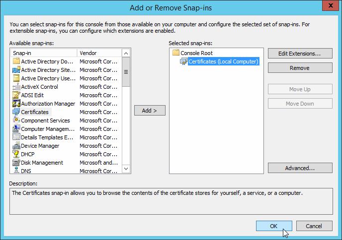 First of all, you have to export the self-signed certificate from your Exchange server. To do it, logon to your server, run mmc.exe and add Certificates (for a local computer) snap-in.