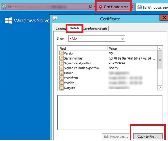 You can also export the SSL certificate directly from the browser. In Internet Explorer, open the HTTPS address of your web server with an untrusted certificate (in the case of Exchange, this is usually an address of the form https://exchange_cas/owa). Click the Certificate Error icon in the address bar, click View Certificate, and go to the Details tab. Click the Copy to File button to open the Certificate Export to CER file wizard.