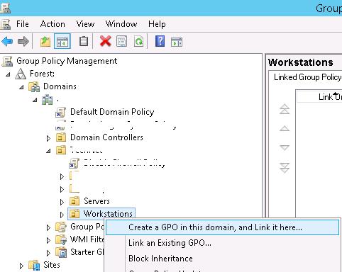Let’s go to the creation of a new certificate deployment policy. To do it, start the Group Policy Management console (gpmc.msc). Create a new policy by selecting the OU (in our example, it is the OU containing computers since we don’t want the certificate to be installed on servers and technological systems), and in the context menu select Create a GPO in this domain and Link it here…