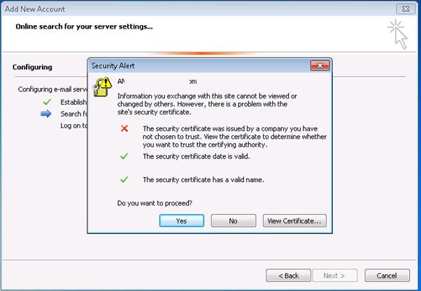 Now during Outlook configuration the warning of the untrusted certificate won’t appear.