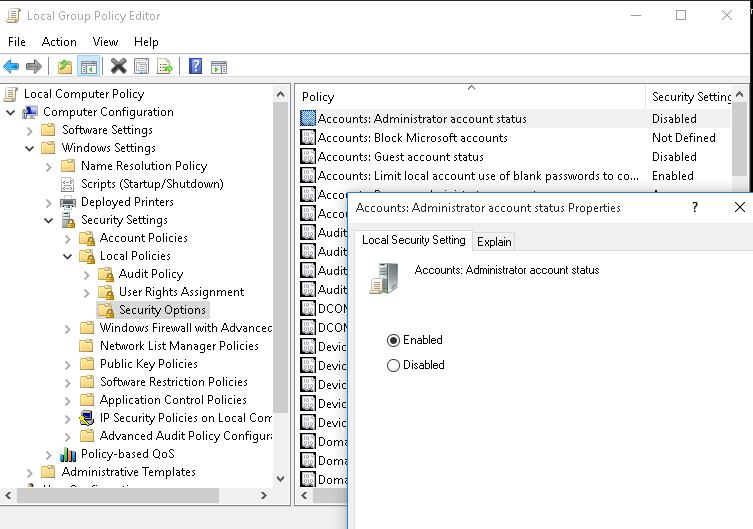 You can enable the built-in administrator account through the local GPO. Open the Local Group Policy Editor gpedit.msc (or Local Security Policy Editor — secpol.msc). Go to Computer Configuration -> Windows Settings -> Security Settings -> Local Policies -> Security Options. Find Accounts: Administrator account status policy and set it to Enable.