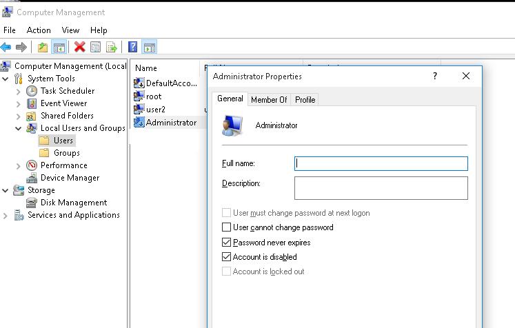 compmgmt.msc and lusrmgr.msc) and the Local Group Policy Editor (gpedit.msc).Open the MMC snap-in Local Users and Groups?by entering lusrmgr.msc in the search bar or in the command prompt. In the console window, expand the Users section. Find the account named Administrator and double-click it, then uncheck Account is Disabled. Save the changes.