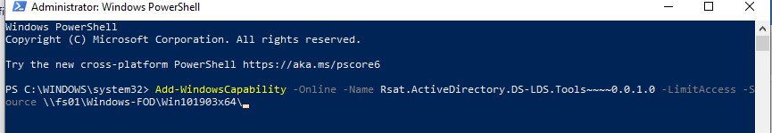 Add-WindowsCapability -Online -Name Rsat.ActiveDirectory.DS-LDS.Tools~~~~0.0.1.0 -LimitAccess -Source \\fs01\Windows-FOD\Win102004x64\