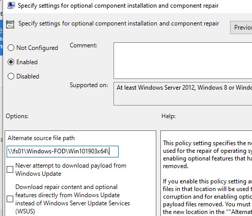 You can also use the above Group Policy option to specify the path to the directory containing the FoD image components. Specify the UNC path to the directory containing the FoD files in the Alternative source file path parameter.