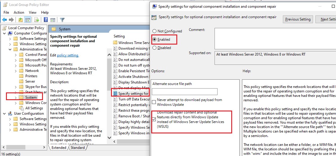 - Enable the policy Specify settings for optional component installation and component repair, and check the option Download repair content and optional features directly from Windows Updates instead of Windows Server Updates Services (WSUS);