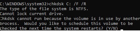 Cannot lock current drive. Chkdsk cannot run because the volume is in use by another process.? Would you like to schedule this volume to be checked the next time the system restarts? (Y/N).