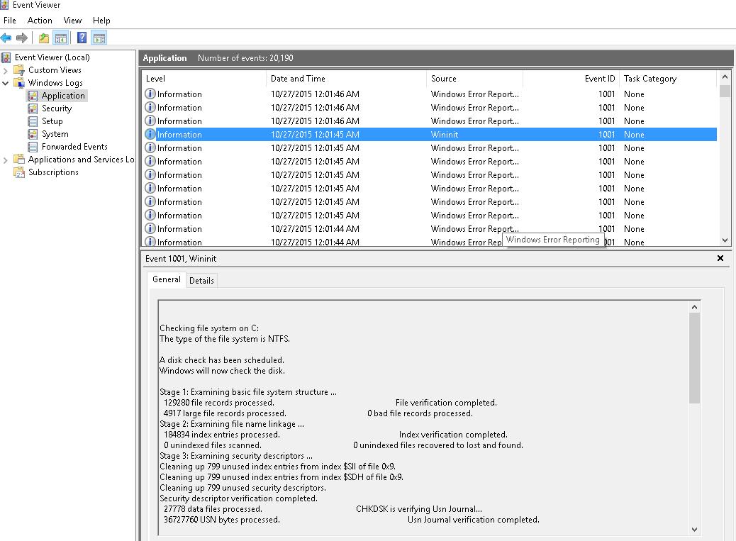 The first found event with the Event ID 1001 and the source Wininit has to be displayed. In the General tab, a detailed log with the results of the latest disk check will be shown.
