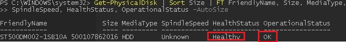 Get-PhysicalDisk | Sort Size | FT FriendlyName, Size, MediaType,SpindleSpeed, HealthStatus, OperationalStatus -AutoSize