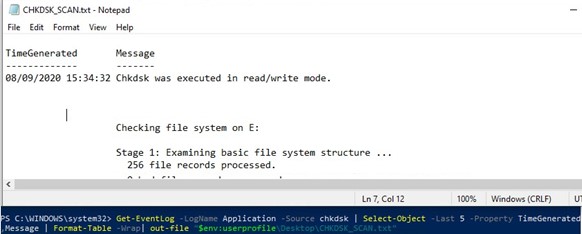 Get-EventLog -LogName Application -Source chkdsk | Select-Object -Last 5 -Property TimeGenerated,Message | Format-Table -Wrap| out-file "$env:userprofile\Desktop\CHKDSK_SCANS.txt"