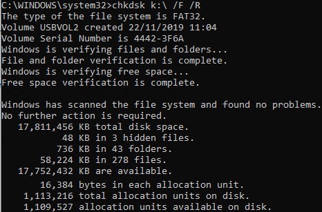 If no errors are found on the disk, you will see a NoErrorsFound message.
