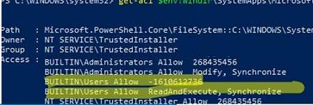 C:\Documents and Settings\username\AppData\Local\Packages\Microsoft.Windows.Cortana_******(alternatively, you can use the unlocker tool to kill the process that is locking this folder). Reboot your computer. The Cortana folder will appear again and after a few minutes the search should work; - Check the NTFS permissions on the folder C:\Windows\SystemApps\Microsoft.Windows.Search_cw5n1h2txyewy. All computer users must have Read+Execute permissions (BUILTIN\Users -> Allow ReadAndExecute, Synchronize). You can list folder NTFS permissions with PowerShell: