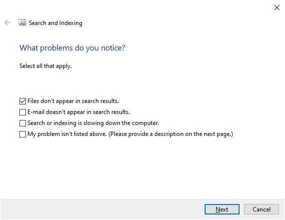 - Select your problem (most likely it will be “Files don’t appear in search results”) and click Next;
