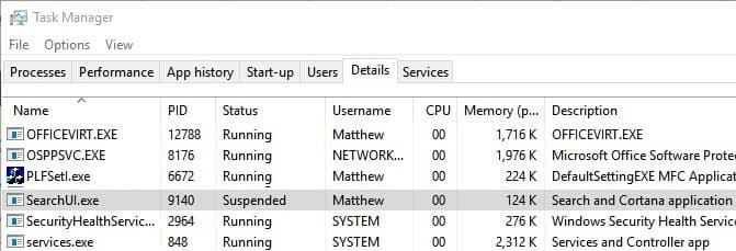 - Find SearchUI.exe in the list of processes, right-click on it and select End Task;