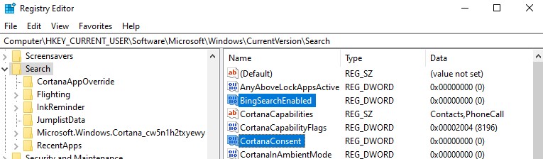 - Change the value of the BingSearchEnabled and CortanaConsent parameters to 0; If these registry settings are missing, create them manually (use the ?REG_DWORD 32 parameter type). You can create and set these parameter values with the following commands: