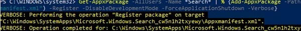 Get-AppxPackage -AllUsers -Name *Search* | % {Add-AppxPackage -Path ($_.InstallLocation + "\Appxmanifest.xml") -Register -DisableDevelopmentMode -ForceApplicationShutdown -Verbose}? - Enable autostart for the WSearch service: