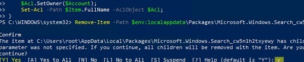 %LOCALAPPDATA%\Packages\Microsoft.Windows.Search_cw5n1h2txyewy. For this, you must change the owner of the folder to the local Administrators group. This can be done manually in Windows Explorer (Security tab in folder options) or using the following PowerShell script: