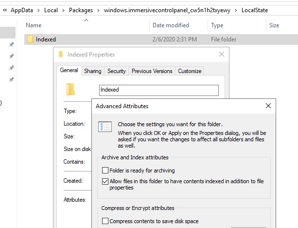 %LocalAppData%\Packages\windows.immersivecontrolpanel_cw5n1h2txyewy\LocalState; - Open the properties of the Indexed folder and click the Advanced button. Make sure that the option “Allow files in this folder to have contents indexed in addition to file properties” is enabled;