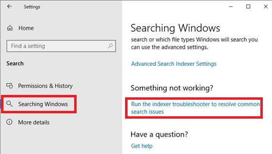 - Go to Settings -> Search -> Searching Windows. Scroll down the list and click on “Run the indexer troubleshooter to resolve common search issues”;You can start the Windows Search troubleshooter from the command prompt:?