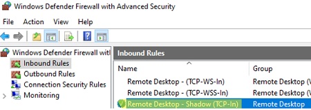 File and Printer Sharing (SMB-In)andRemote Desktop - Shadow (TCP-In). The last rule allows remote access to theRdpSa.exeprocess. You can enable Windows Defender rules on user computers through a GPO or by using the Enable-NetFirewallRule PowerShell cmdlet.