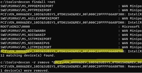 devcon -r remove '@PCI\VEN_8086&DEV_10D3&SUBSYS_07D015AD&REV_00\000C29FFFF66A80700'