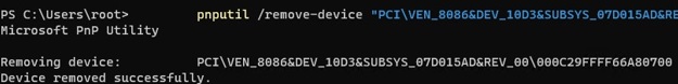 pnputil /remove-device "PCI\VEN_8086&DEV_10D3&SUBSYS_07D015AD&REV_00\000C29FFFF66A80700"