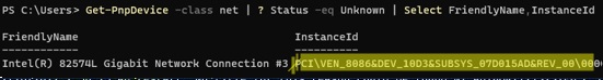 Get-PnpDevice -class net | ? Status -eq Unknown | Select FriendlyName,InstanceId