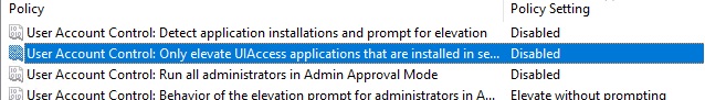 Disabled; - User Account Control: Only elevate UIAccess applications that are installed in secure locations =