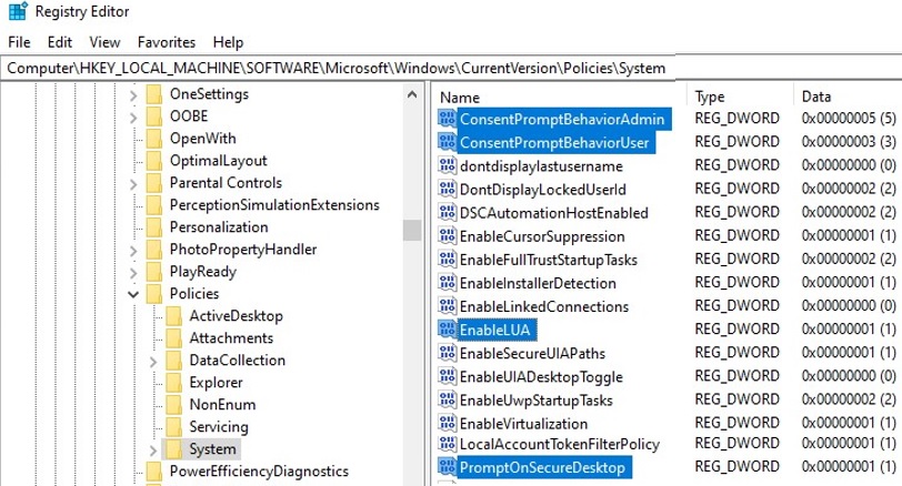 "ConsentPromptBehaviorAdmin"=dword:00000005 "ConsentPromptBehaviorUser"=dword:00000003 "EnableInstallerDetection"=dword:00000001 "EnableLUA"=dword:00000001 "EnableVirtualization"=dword:00000001 "PromptOnSecureDesktop"=dword:00000001 "ValidateAdminCodeSignatures"=dword:00000000 "FilterAdministratorToken"=dword:00000000