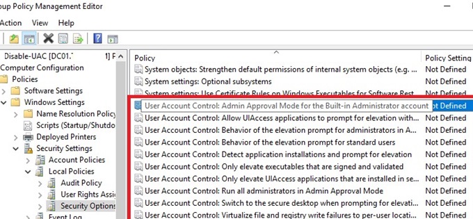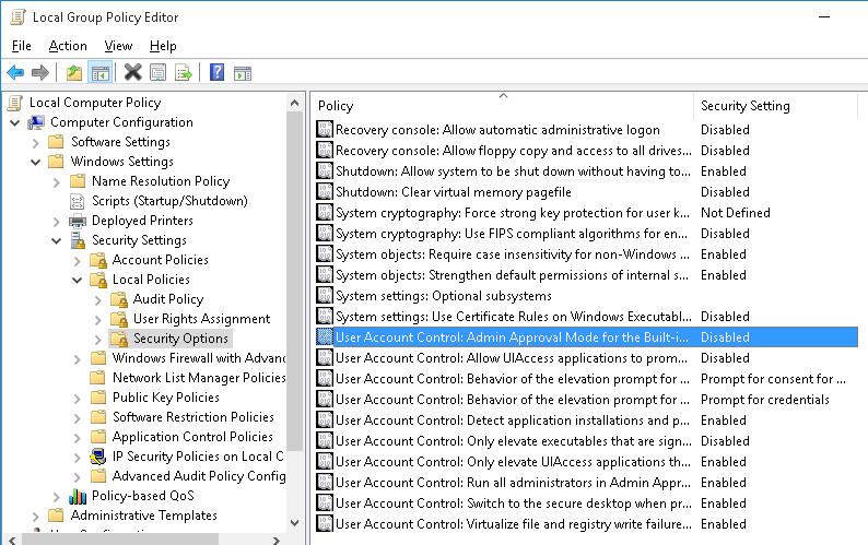 Disabled; - User Account Control: Run all administrators in Admin Approval Mode =