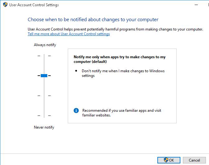 In Windows 7 (and newer), the UAC settings on the computer are managed using a special slider (called through the control panel or the UserAccountControlSettings.exe file). Using the slider, you can select one of four predefined User Account Control protection levels.