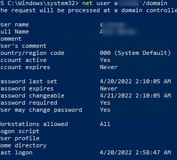 Password last set??????????? 4/22/2022 2:15:15 AM Password expires???????????? Never Password changeable????????? 4/23/2022 2:15:15 AM Password required??????????? Yes User may change password???? Yes Last logon?????????????????? 4/22/2022 2:48:12 AM Logon hours allowed?? All